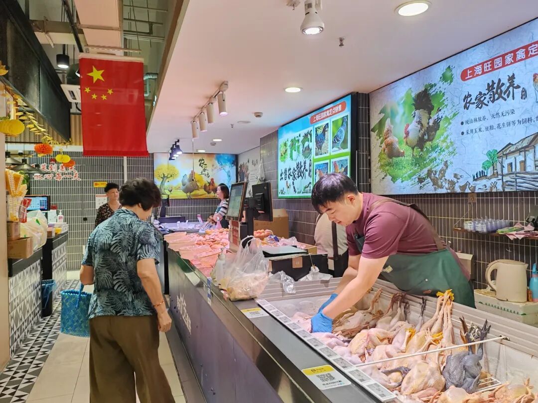肉禽区域,节日的热闹劲儿更足。师傅的冰鲜柜里整整齐齐摆满了凌晨从江苏运来的鸡、鸭、鸽子等。“中秋节快到了,上海市民喜欢吃鸭子,需求量大,所以我们每天会准备50—100只,货源充足。而且价格和平时一样。”摊主一边称重,一边说道。