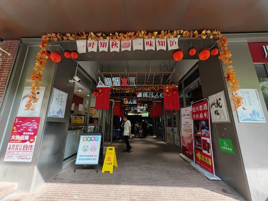 国庆当天,走进美天新渔菜市场,门头、过道挂满了五星红旗,那一抹抹鲜艳的“中国红”在阳光、灯光下跃动,仿佛在向每位顾客诉说节日的喜悦。为了烘托秋日氛围,金黄的落叶以及圆滚滚的栗子、南瓜装饰也被悬挂在市场内,增添了诗与远方的浪漫。