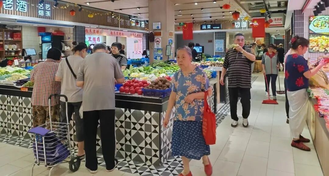 商户们忙着整理货架,居民们提着菜篮穿梭其间,吆喝声、谈笑声、讨价还价声交织成一首生活的交响曲。“这菜场一打扮,节日味儿就浓了!看着红旗,心里都敞亮。”居民王奶奶笑着驻足,抬头望着门头的国旗,眼里满是欢喜。