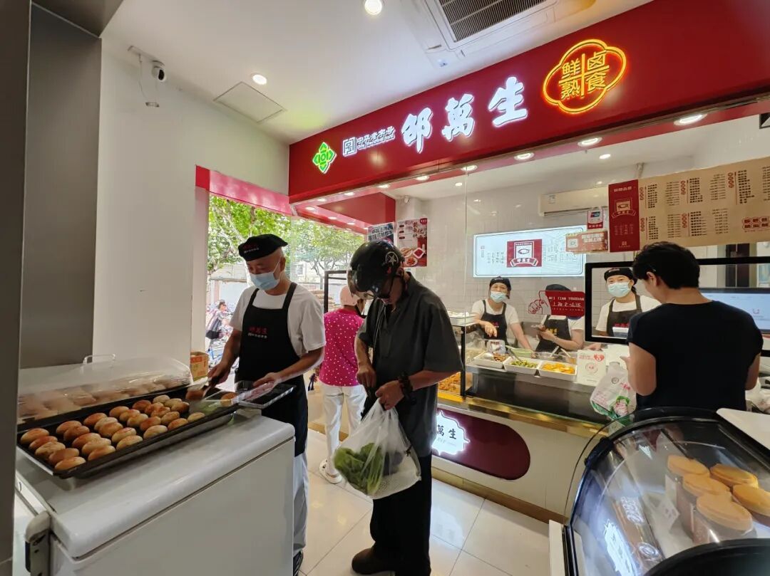 菜市场外的熟食店铺也销售火热。在有着上海“糟醉大王”美誉的邵万生门店,络绎不绝的市民挑选着里面的“顶流”。“给我来一盒糟带鱼,再来点酱鸭。”“老板,给我称点四季烤麸、糟毛豆。”