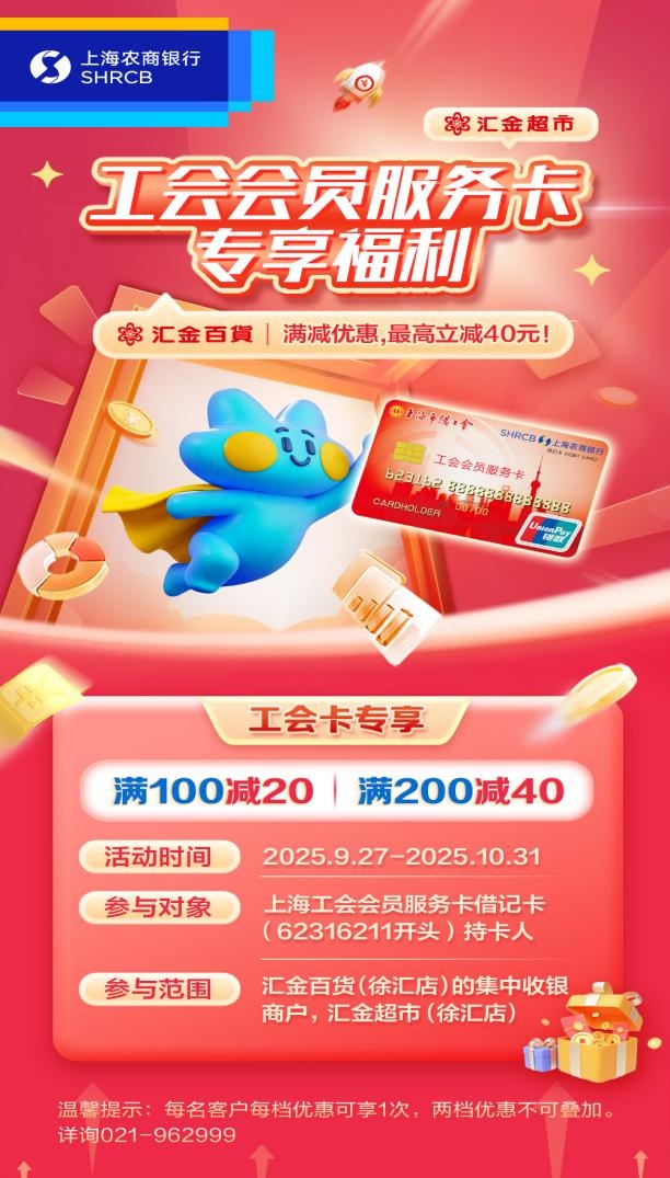 上海农商银行与徐汇区特别打造“金融助老·银龄惠购”主题促消费活动,携手多家社区食堂、老字号品牌,推出消费满减优惠,日常用餐更省钱;与汇金百货合作上线“孝心支付礼”,使用工会卡支付即可享满减福利,让您购物尽享贴心折扣!