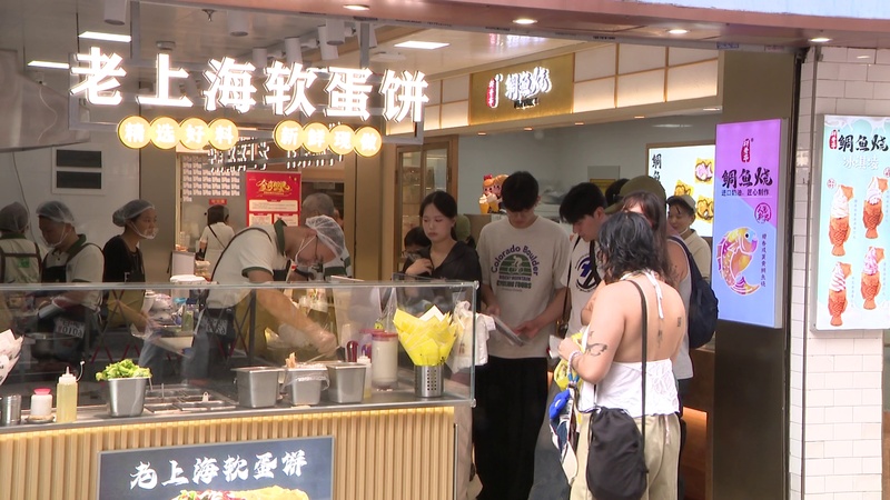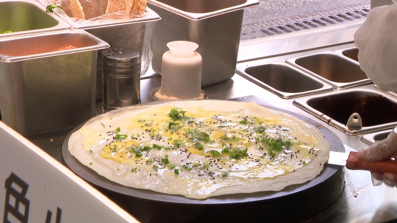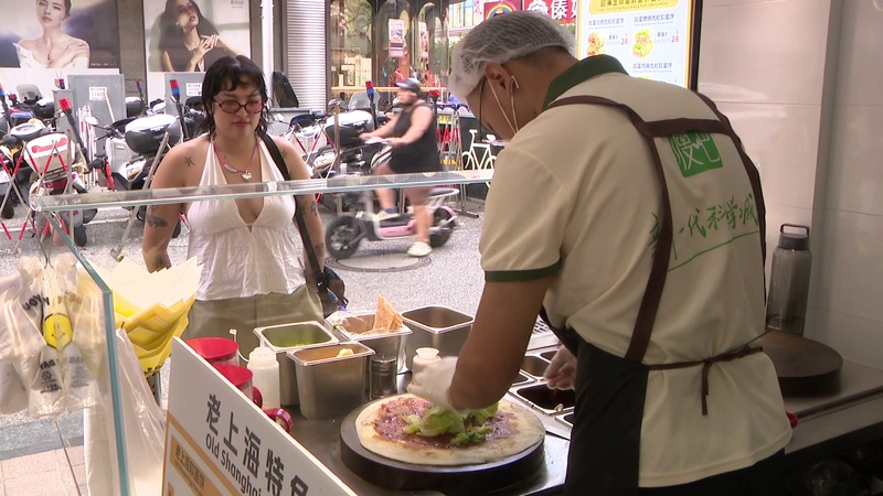 而一旁专卖老上海蛋饼、油墩子等品种的老上海特色小吃店铺同样也吸引了不少市民游客,老外闻香而来,在香气扑鼻的蛋饼中再添加自己中意的食材,满满的幸福感油然而生。