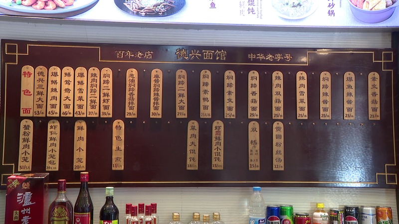 前不久,肖战在电视剧里的一句台词使广东路上的德兴馆成为网红打卡地,不少游客不惜远道而来排上几个小时就是为了想尝尝这碗网红面。其实德兴馆在上海有好几家店,在山西路上离大壶春不远处就有一家。记者走进门店,收银台前的铭牌显示,除了经典的闷蹄二鲜大面之外,闷蹄面还有好几个品种。