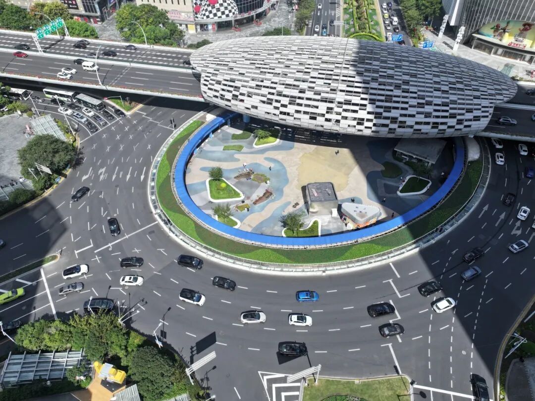 淞沪路黄兴路顶板花坛将几何美学与国庆主题完美融合,花坛平面以对称型曲线为骨架,点缀着象征家国情怀的五角星元素,线条流畅又充满仪式感。草花选择上,在一串红、超级凤仙营造的热烈氛围基础上,特别搭配五星型的孔雀草,让整个花坛既有色彩的绚烂,又有几何的规整,站在高处俯瞰,规整的图案与周边道路相映成趣,明亮的色彩不断传递着国庆的热烈气息,让人忍不住驻足欣赏这份独特的花坛之美。