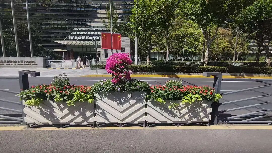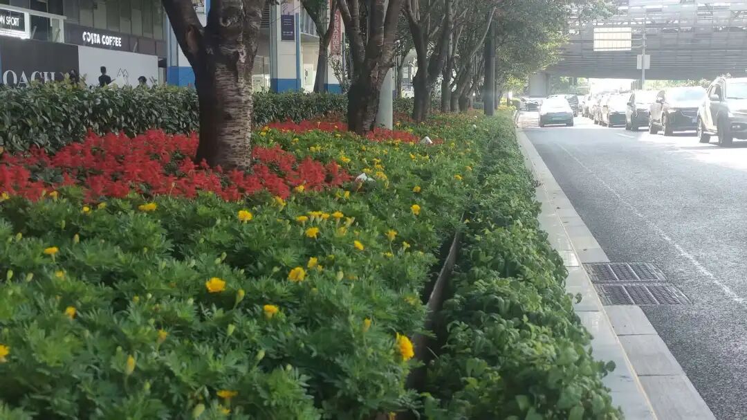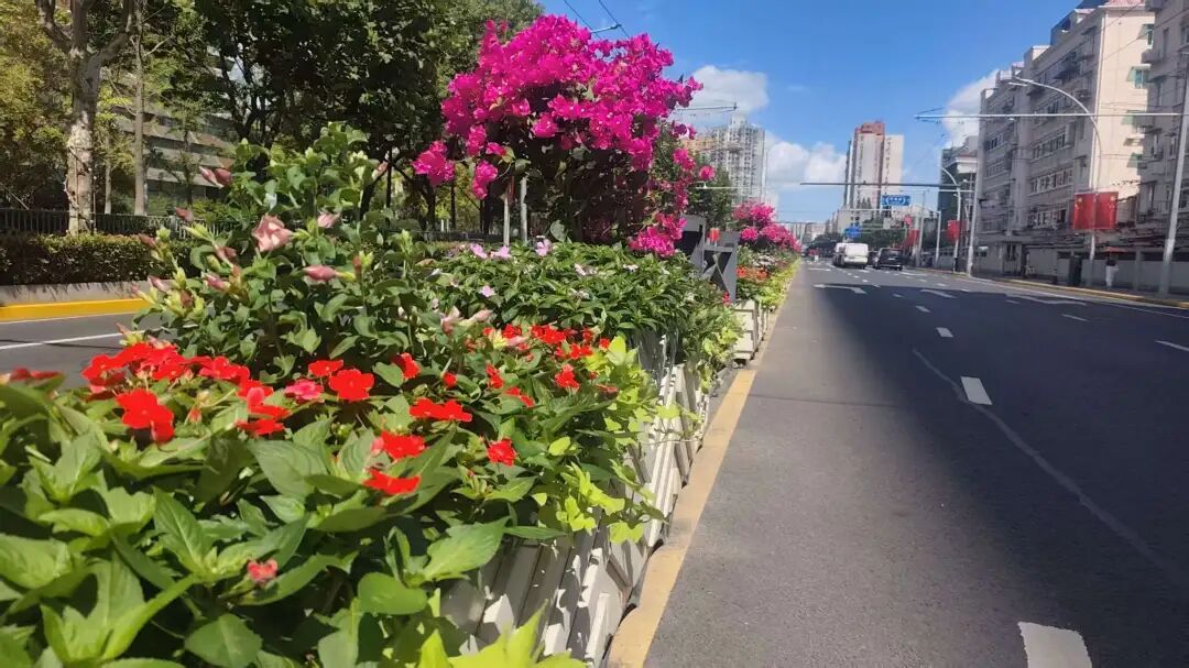 长阳路中央隔离带的花箱设计同样独具匠心,以三角梅为主体,紫婵为辅花,红色、淡紫色的超级凤仙为补充花,层次分明,色彩斑斓,将中隔带沿线营造成花的海洋。