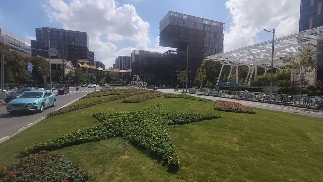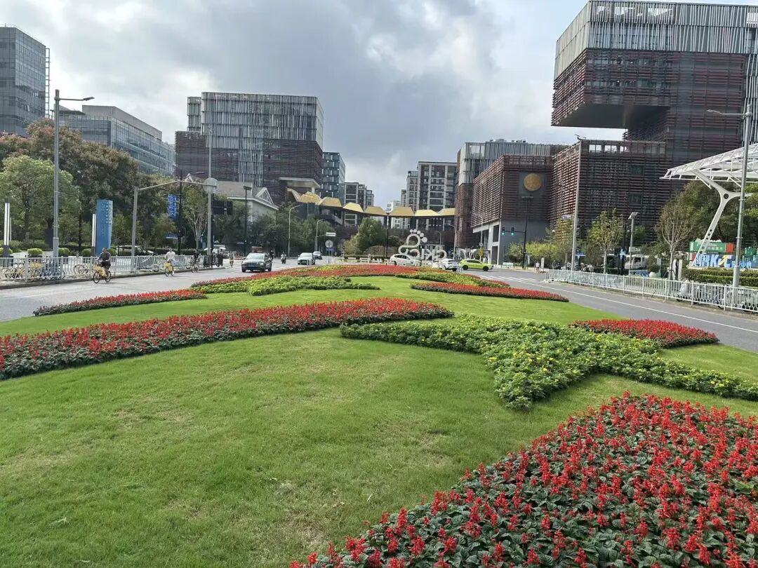政立路国通路,这里的花坛以“星星”为核心主题,用热烈的一串红与明媚的亮黄色孔雀草巧妙搭配,不仅勾勒出极具视觉冲击力的图案,更将“欣欣向荣”的节日气氛拉满,让每一位路过的市民都能感受到祖国蒸蒸日上的活力与百姓安居乐业的幸福。
