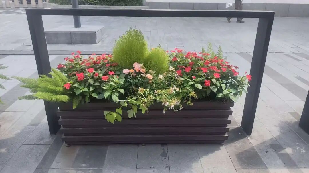 除主干道花坛外,杨浦区还重点打造了多个重要花箱点位,涵盖合生汇周边及控江路、四平路等路段。其中,合生汇点位周边107组花箱,以地肤为主体,结合果汁阳台月季、大花六道木、猩红色超级凤仙、金叶番薯等品种。胖嘟嘟的地肤,清新淡雅的月季与六道木搭配喜庆的红色,营造浓烈的国庆假氛围。