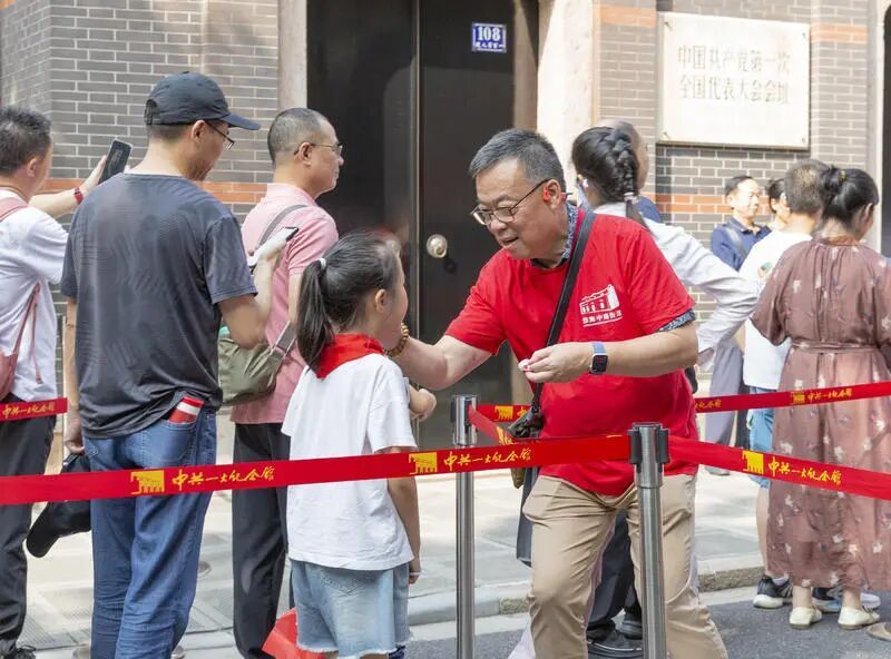 “请大家有序排队,往这边走!”“需要合影吗?我来帮您!”面对络绎不绝的参观人流,志愿者们化身“秩序守护者”,在纪念馆入口、国旗广场及周边要道忙碌穿梭。秩序维护、语言翻译、合影拍摄……他们用暖心服务让来自五湖四海的游客感受到上海——党的诞生地的城市温度。