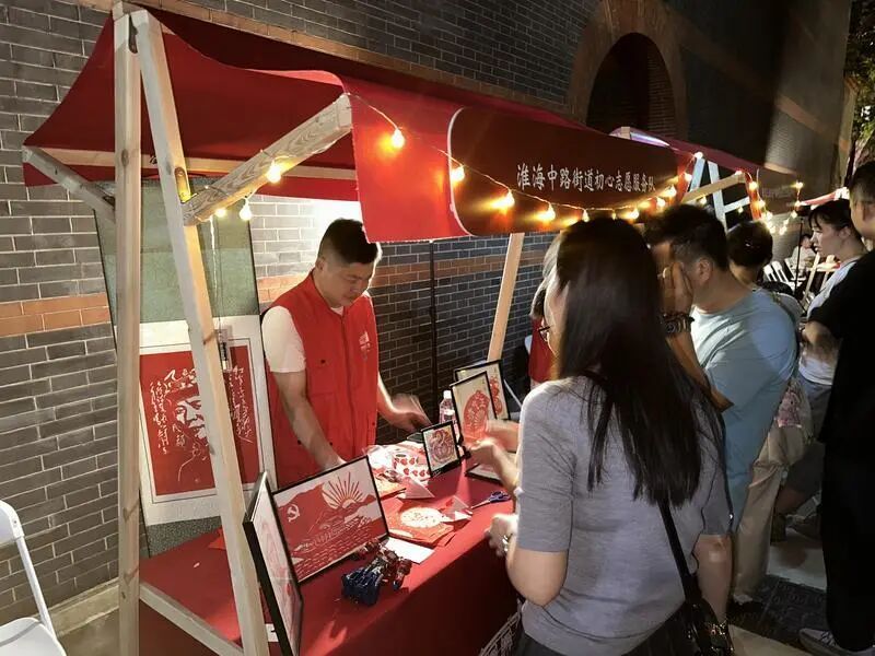 傍晚时分,中共一大会址出口处人头攒动。由淮海中路街道与中共一大纪念馆联合打造的“从胜利走向胜利——庆祝新中国成立76周年”红色文化集市热闹开街,瞬间点燃了城市夜晚的热情。