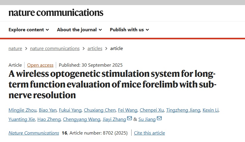 9月30日,复旦大学附属华山医院手外科蒋苏副教授团队联合复旦大学脑科学研究院张嘉漪/颜彪教授课题组的最新研究成果,《一种可长期检测小鼠上肢功能的亚神经分辨率无线光遗传刺激系统》(A wireless optogenetic stimulation system for long-term function evaluation of mice forelimb with sub-nerve resolution),在线发表于《自然·通讯》(Nature Communications)。本研究开发的FIMOSS系统为神经损伤或神经移位手术后的个性化诊断与治疗提供了新的手段。