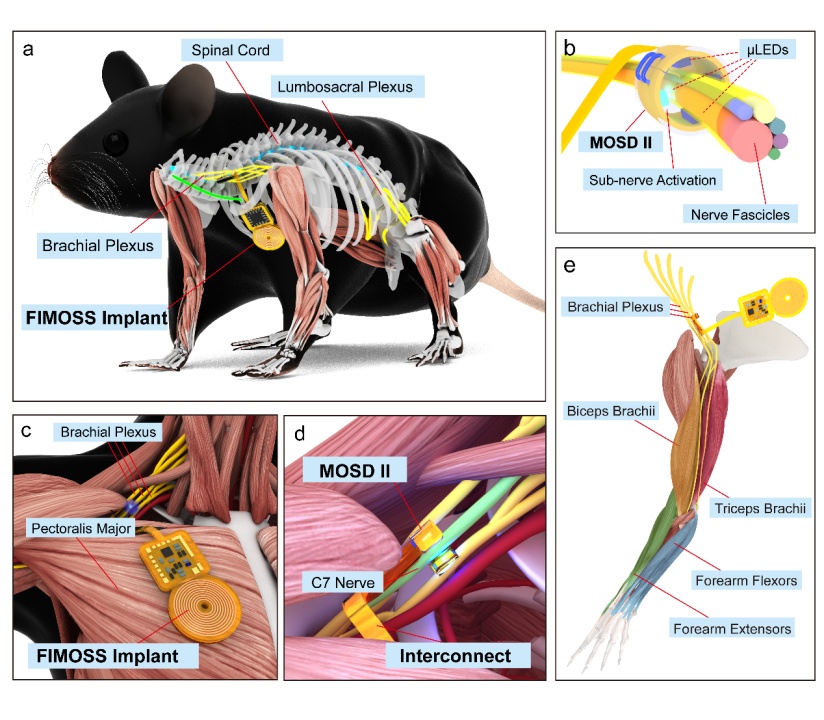 每年,不同类型的神经损伤会导致全球超过数百万患者出现上肢功能障碍。当前,周围神经移位术能够有效改善上肢运动功能。然而,术后的每个个体恢复效果和速度存在差异,难以精确预测。针对该科学问题,复旦大学附属华山医院手外科蒋苏副教授团队联合复旦大学脑科学研究院张嘉漪/颜彪教授课题组,成功研发出一套全植入式柔性多点光遗传学刺激系统FIMOSS。