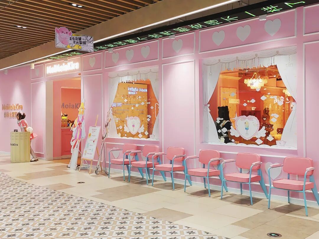 为了赶上与coser的互动,曹女士还没来得及吃午饭,她把目光投向了身后不远处的咖啡店:这家名为“MoiMoiKira”的偶像主题餐厅开业刚满三周,整个店面被装饰成粉色,从玻璃透出暖黄的灯光。