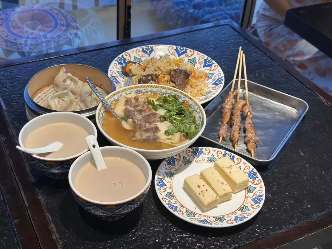 跟着陆静怡走进店里,可以看到:店铺面积不大,但是整家店的装修充满异域风情——绿色墙面配上花砖,墙壁上还悬挂着毛毯装饰画,连餐具也是别具特色。在和店员聊天时,陆静怡得知娜尔集市是旁边塔哈尔的旗下品牌,它在风格上延续了民族风情,在菜品上主打便捷实惠,既有特色早餐点心,也有面或米饭等主食。帕芙立是一款新疆特色甜品,由多层酥皮和奶油状馅心制成,初尝时,奶香浓郁,香而不腻;再喝上一口“会跳舞的奶茶”,入口醇厚又丝滑。薄皮羊肉包子里的羊肉配上甜口的洋葱,再撒上胡椒,解腻又丰富了口感。就在不久前,陆静怡还带着自己的妈妈去“二刷”这家店,她给大家推荐了多种打卡方式:约早上8点,门店开始营业,大家可以悠闲地吃个早饭;傍晚,可以在外摆位上吹吹晚风,聊聊天;到夜间,飘香四溢的炭烤牛肉、羊肉、鸡翅也能满足“夜宵星人”的深夜胃。浪漫情调的小众餐厅