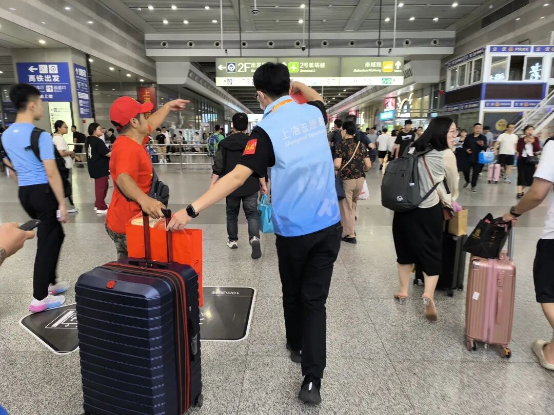 当国庆节的第一缕阳光洒向虹桥枢纽,这里已开启假期限定版“人潮模式”。在川流不息的人群中,来自区委组织部选调储备队伍的“蓝马甲”志愿者格外亮眼。他们用脚步丈量虹桥枢纽的每个角落,用贴心服务为匆忙旅途注入温暖,让“安心”成为旅客们最真切的出行感受。