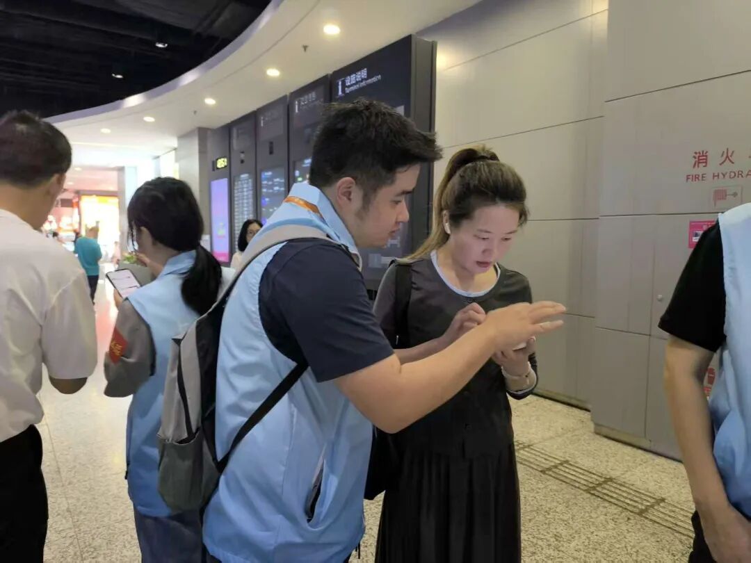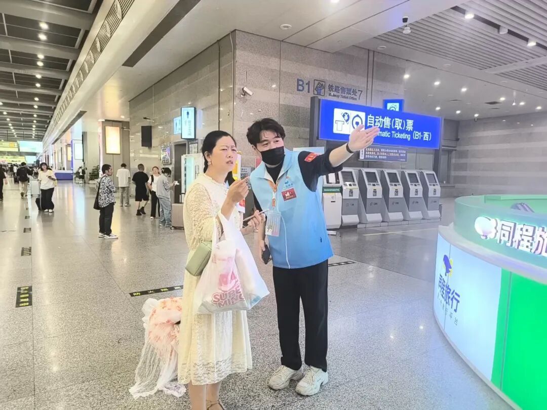 志愿者陈华炜见状立即启动“两步法”——先凭对站内结构的充分熟悉,把大爷引导至高铁接站区;再同他女儿拨通视频电话,通过镜头里的指示牌、商铺logo锁定位置,几分钟内便帮大爷找到了家人。