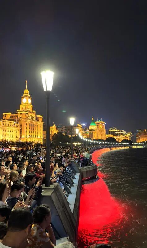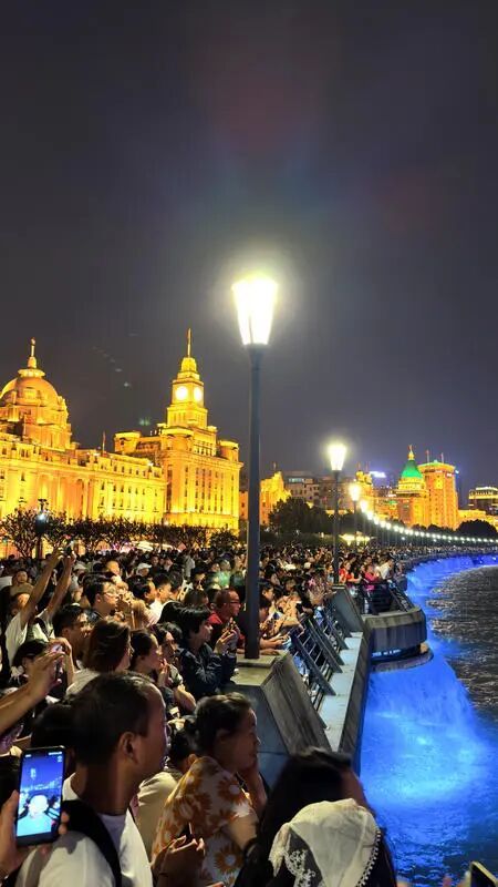 昨晚7点,记者在外滩现场看到,众多市民游客纷纷前来欣赏浦江两岸的璀璨夜景,为祖国庆生。亲水平台上人头攒动,热闹非凡。
