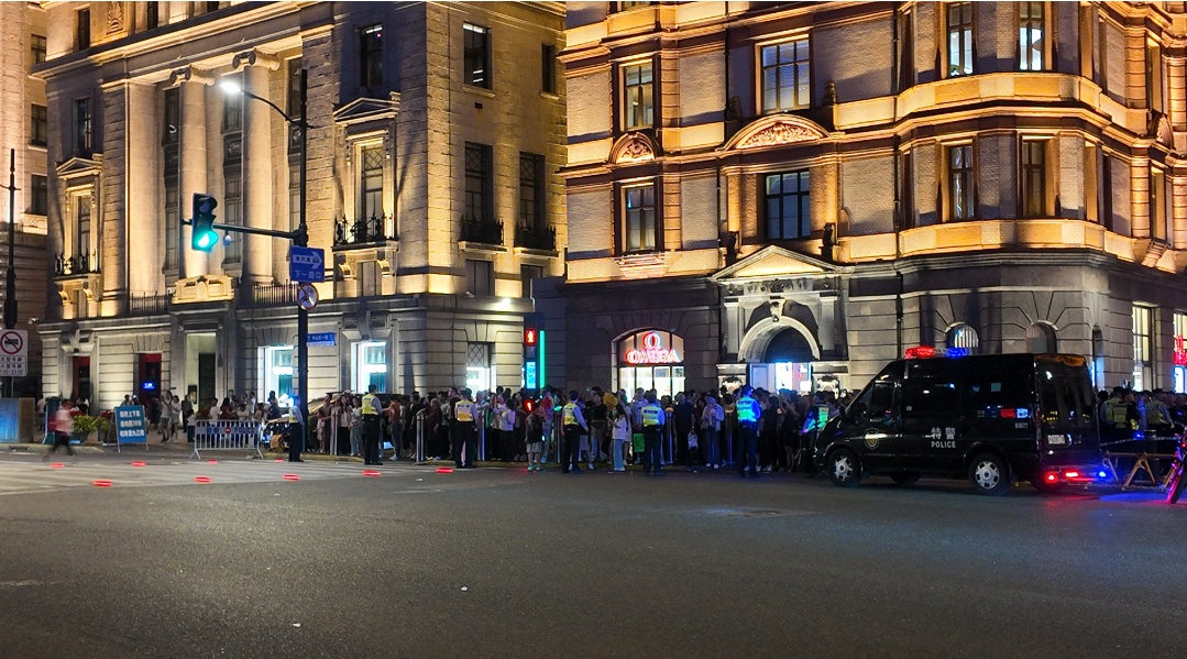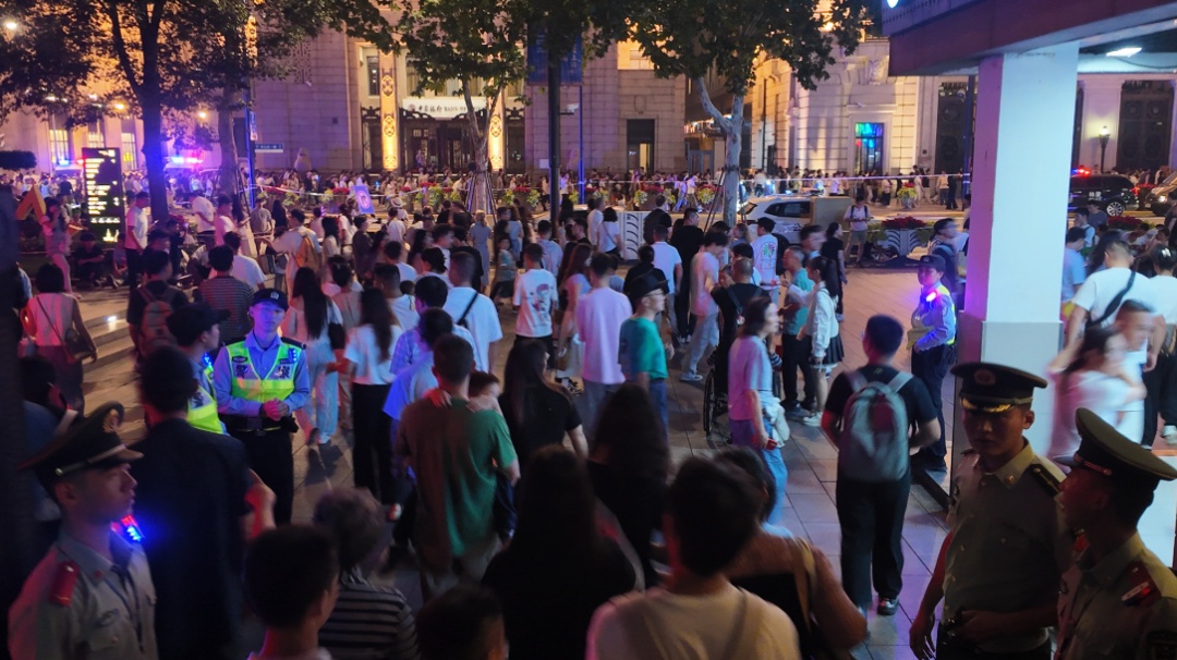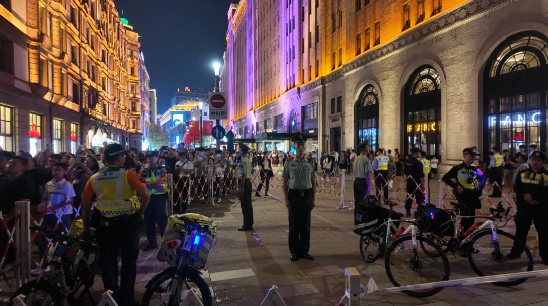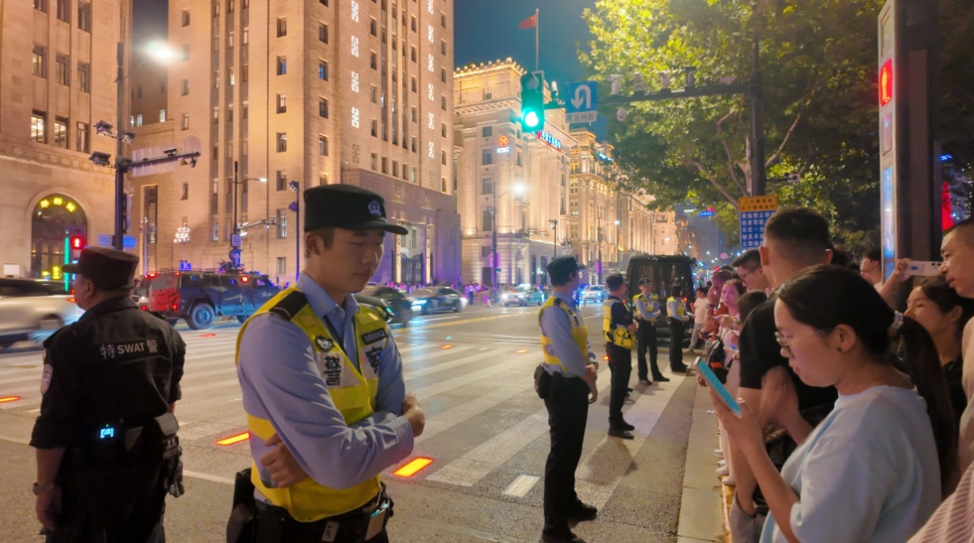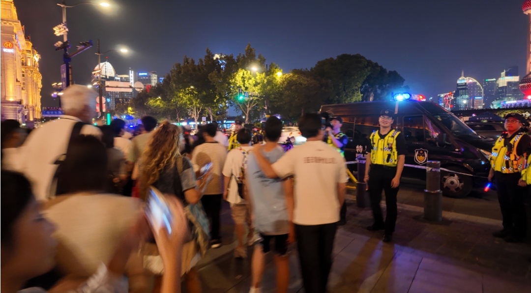 在江堤上,铁马整齐排列,将整个外滩区域划分得井井有条。武警和民警不间断地进行巡逻,随时准备应对可能出现的突发事件。同时,江堤的各个出入口都实行了单向通行的调整措施,确保人流的有序流动。