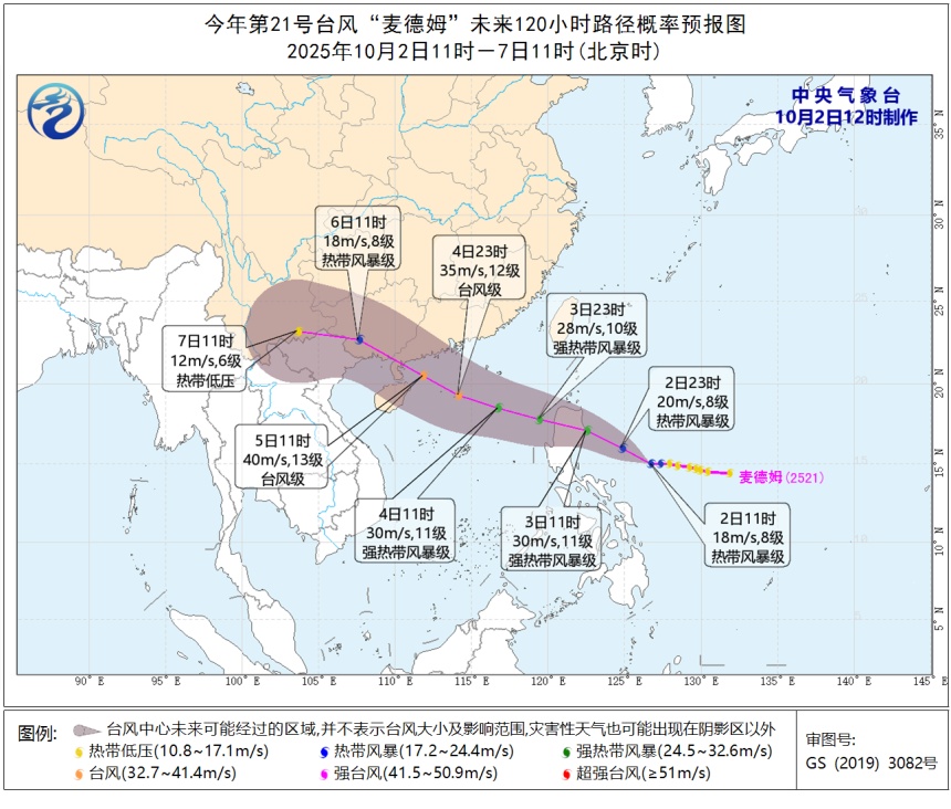 中央气象台介绍,今年第21号台风“麦德姆”已经生成(英文名称:Matmo;名字来源:美国;意义:大雨),今日11时,其中心位于距离菲律宾马尼拉偏东方向约620公里,强度为热带风暴级(8级,18米/秒)。预计,“麦德姆”将向西偏北方向移动,强度逐渐增强,3日白天将在菲律宾吕宋岛东部沿海登陆,以后穿过菲律宾吕宋岛北部,3日夜间到4日凌晨将移入南海东部海面,以后逐渐向广东西部到海南岛东部一带沿海靠近。
