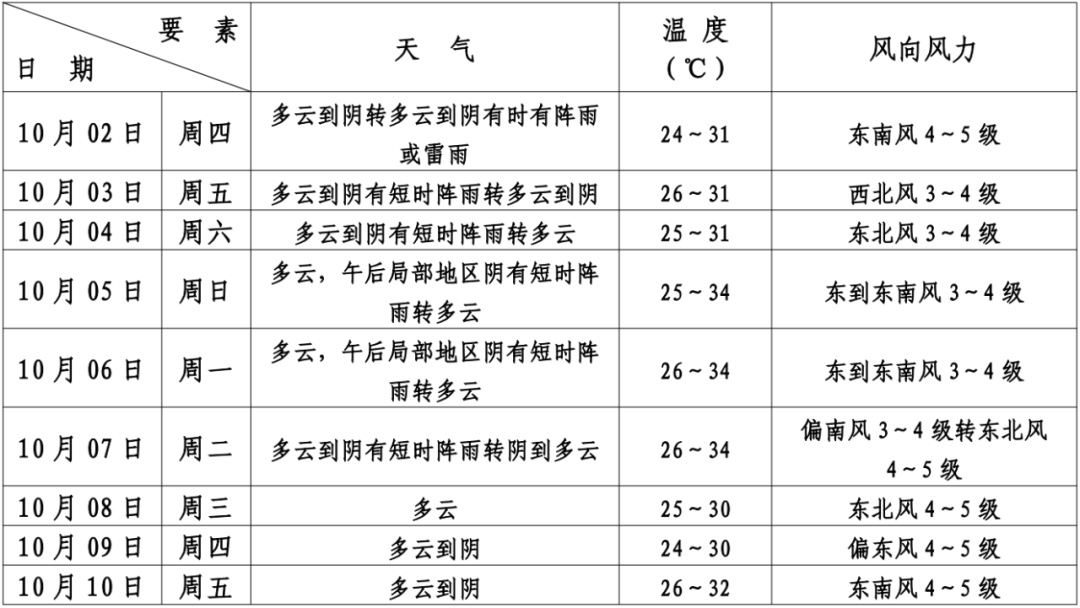 据最新气象资料分析:今天傍晚到上半夜,受强对流云团影响,本区将有一次雷阵雨天气。国庆假期其余时段,本区以多云为主,局部地区有短时阵雨,气温先升后降,10月5—7日最高气温34℃左右。