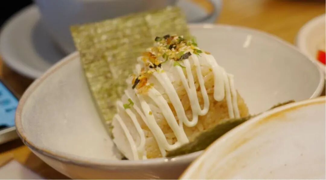 鲸鱼饭堂主打饭团与盖饭,坚持无预制、全现做。吃到的每一口,都不是工业料理包加热的产物,而是从洗米、蒸饭、炒料,到最终出餐,全部在店内当日完成。 饭团的内馅一点也不将就:黄油慢炒菌菇,奶香与鲜味交织;腊肉炒当季鲜笋,咸香中带着清脆。盖饭则讲究现炒现调,酱汁浓郁、荤素均衡,每一碗都是刚出锅的温暖。 鲸鱼饭堂格外看重食材的源头。大米选用江南优质稻米,米香浓郁、口感软糯;时令食材如春笋、秋菇等,也尽量从江浙一带采购,延续“鱼米之乡”的物产脉络。调味力求干净,减少添加,突出食材本味——就像家里做菜那样,认真却不复杂。