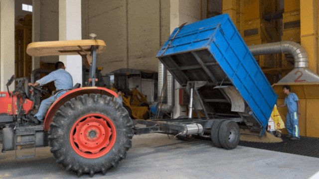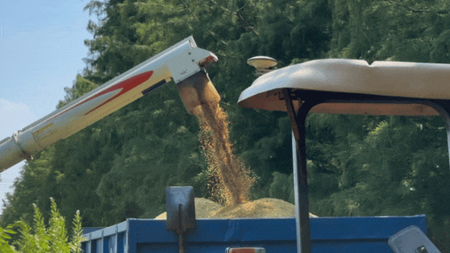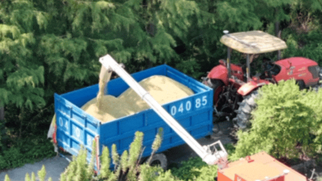 待粮仓满载后,稻谷便通过卸粮筒直接转入稻田旁的随行拖拉机中,运往附近的外冈镇粮食烘干中心。