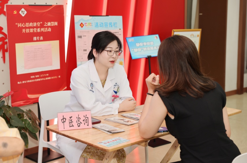 “静邻一家・非遗幸福工坊”精心设计的传统中秋花灯制作、养生锤制作项目让传统文化在大家的指尖传承。来自静安寺街道社区卫生中心的医生也现场为居民问诊答疑、提供健康建议,将贴心医疗服务送到群众身边。