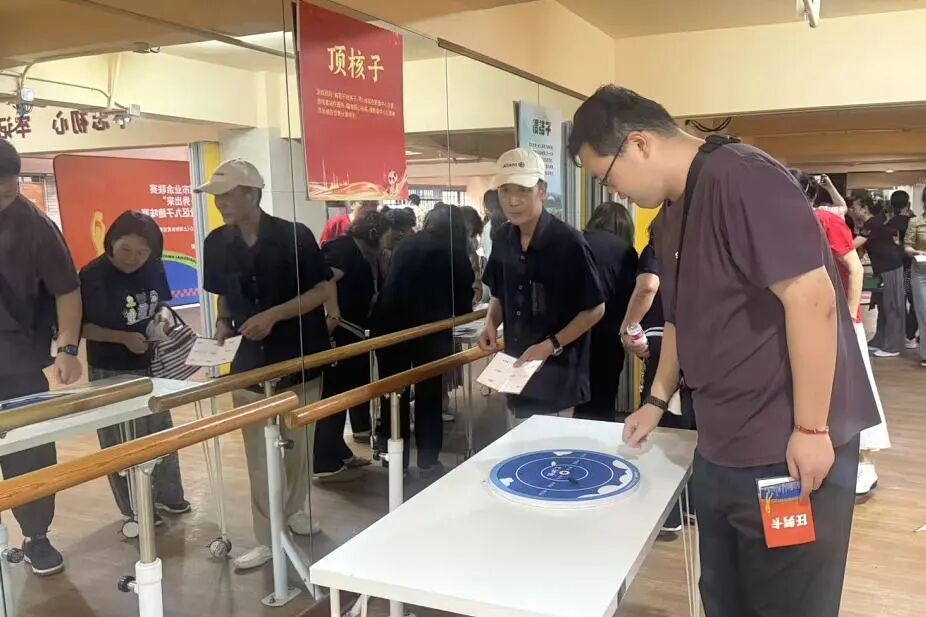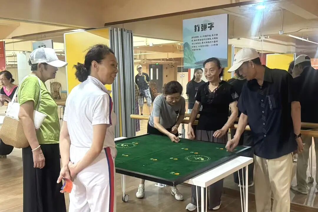“啪、啪、啪”的抽陀子声清脆有力,老师傅手腕一抖,鞭绳精准地落在飞速旋转的陀螺上,引来阵阵喝彩;“造房子”区域,一位阿姨在伙伴的鼓励下,单脚跳跃在方格之间,动作虽不如儿时敏捷,脸上却洋溢着孩童般的灿烂笑容;“打弹子”的台桌前,几位老伯伯俯下身,眯起一只眼,凝神屏气地瞄准目标,玻璃弹珠碰撞的瞬间,仿佛敲响了童年的回响。