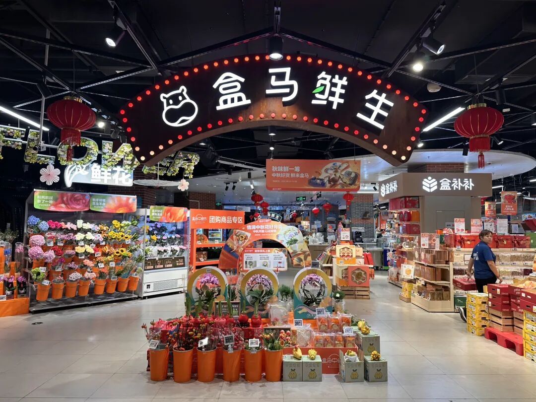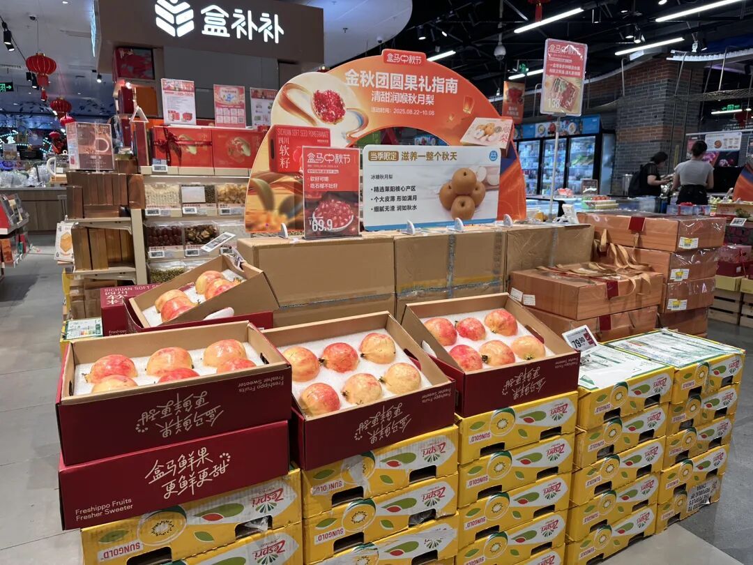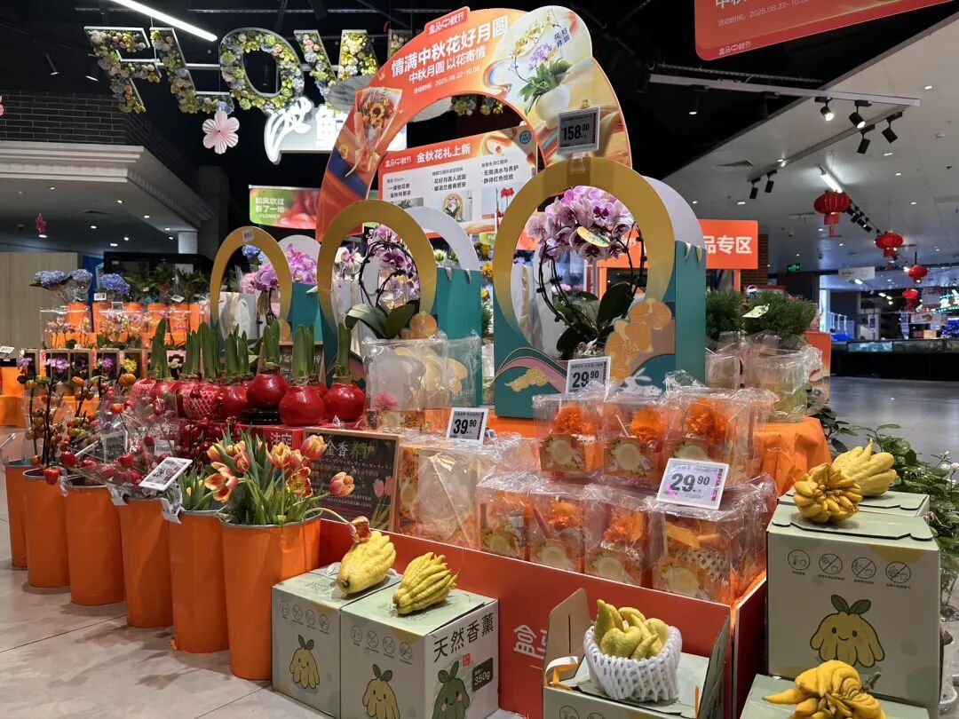 在星宝购物中心盒马门店,各类礼盒食品、零食饮料琳琅满目,整齐地摆放在货架上。恰逢国庆中秋双节同庆,店内还布置了许多特色装饰品,很有过节的氛围。