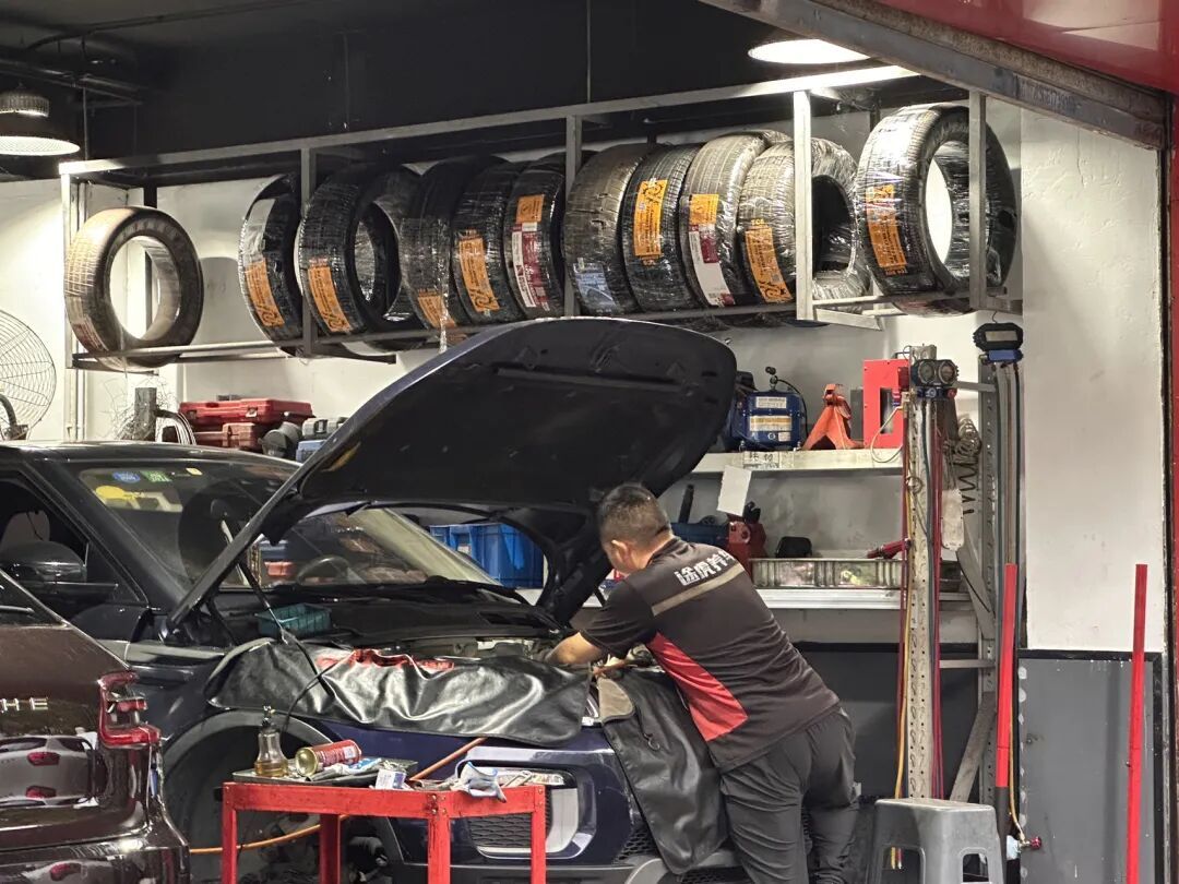 在门店工作近十年的刘师傅介绍:“一般我们会重点检查刹车系统、发动机、轮胎、变速箱、灯光、雨刮器等车辆部位。”他指着轮胎,特别强调,轮胎长期接触地面,很容易受损;如果发现轮胎已严重磨损,应及时更换确保出行安全。