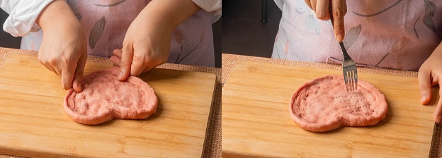 4.面团擀成面饼,捏成心形,用叉子扎出几排小孔,醒发15分钟。