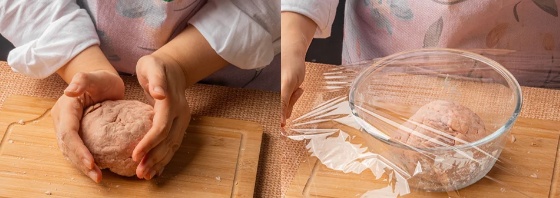 3.搅拌成絮状揉成面团,盖上保鲜膜醒发40分钟。