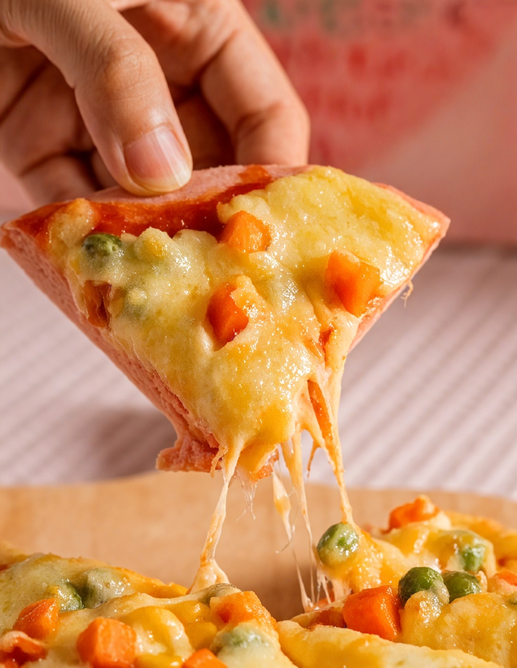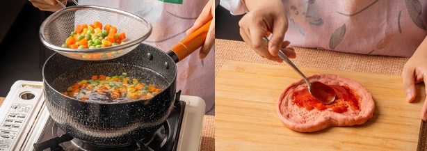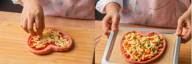 5.胡萝卜丁、豌豆、玉米粒焯水30秒,面饼刷一层番茄酱,放一层芝士碎。
