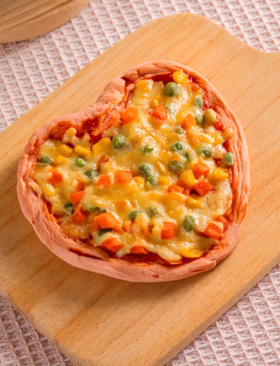中筋面粉300克、牛奶150毫升、玉米油10克、酵母4克、糖4克、红曲粉3克、豌豆30克、玉米粒30克、胡萝卜50克、芝士碎50克、番茄酱10克、调味料5克