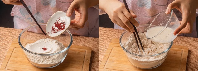 2.面粉中加入红曲粉,倒入调配好的牛奶。