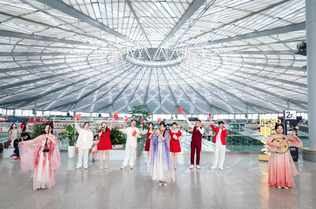 拖着行李箱的旅客一起高唱《歌唱祖国》