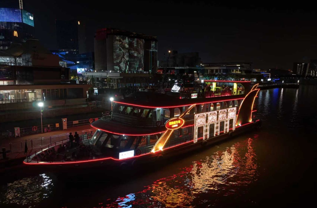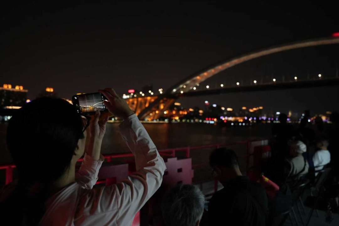 上百名游客乘船夜游,在习习江风中,欣赏西岸国际光影节的绚丽灯光秀,感受“船在江中行,人在画中游”的浪漫。上海浦江游览集团有限公司品牌总监陆晓捷介绍说:“国庆期间,我们以龙华码头为核心,打造了一系列主题航班。1日至3日是‘党的诞生地’主题船首航,4日至5日有‘周同学’主题船,还有专门的宠物友好航班。6日至7日晚则是Mojito演艺航班,船上不仅有Live演出,每位游客还能获赠一杯免费的莫吉托饮料。”
