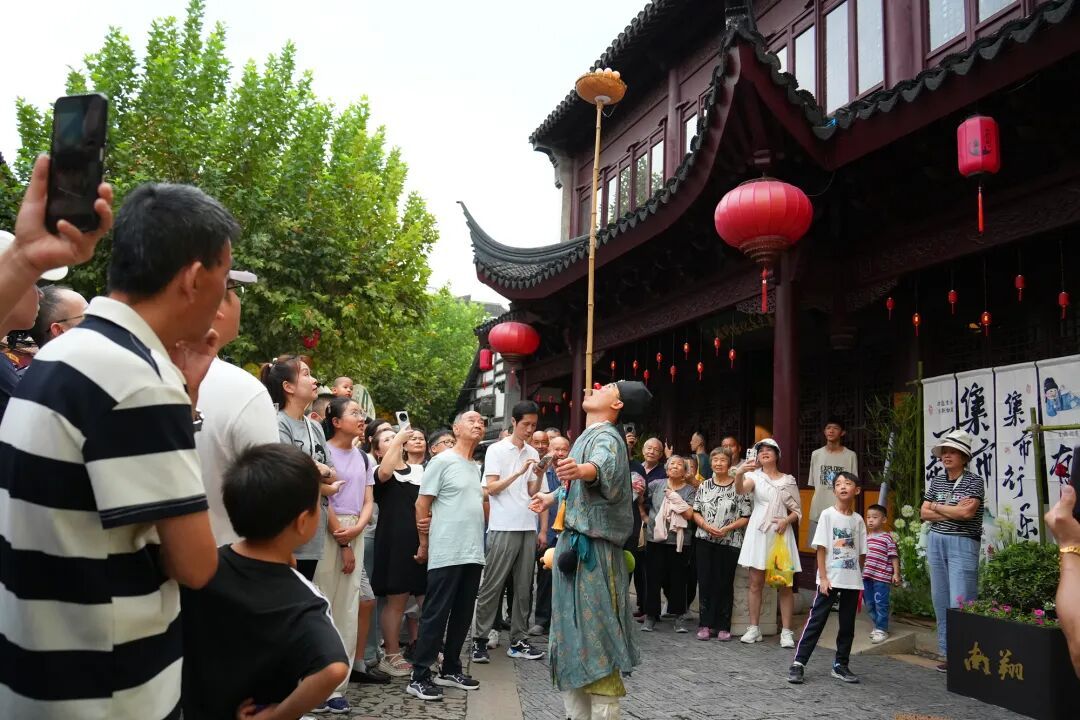 在南翔历史文化陈列馆前的“槎溪·货郎集”,工作人员以一身复古妆造亮相,一边与游客互动,一边售卖主题文创、传统小吃和手工艺品,打造了一幅鲜活的宋代市井图。国潮喜剧表演区域,演艺人员展示杂技表演,重现了南翔千年前“因寺成镇”时摊贩云集的市井景象。“女儿说假期这里有特色活动,今天亲眼看到,果然十分热闹!”游客王勇说。