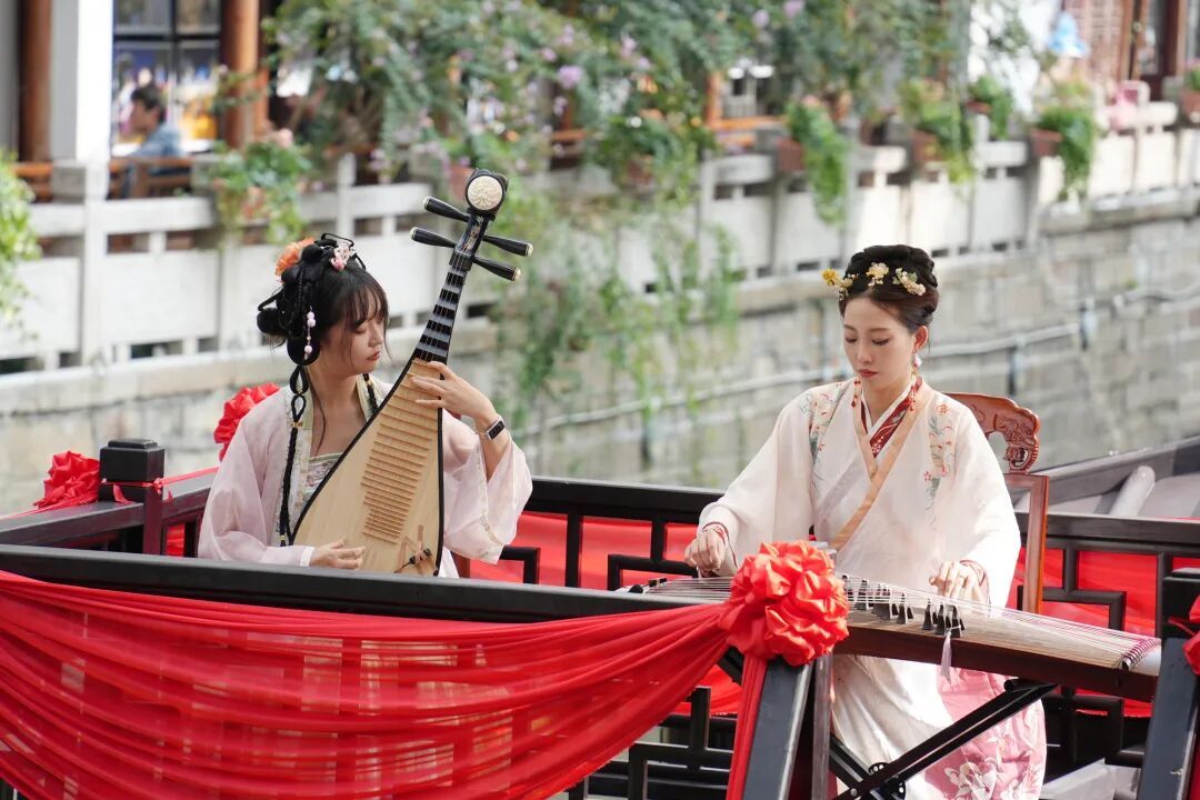 八字桥边的河面上,一艘装饰精美的游船成为流动的舞台。作为国潮大会主题活动“海派国潮乐游”的子活动,“曲韵棹歌”水上国风快闪在此上演。演员们身着汉服,演奏着传统乐器,与波光粼粼的水面相映成趣。岸边游客纷纷驻足,举起手机记录这别具一格的表演。