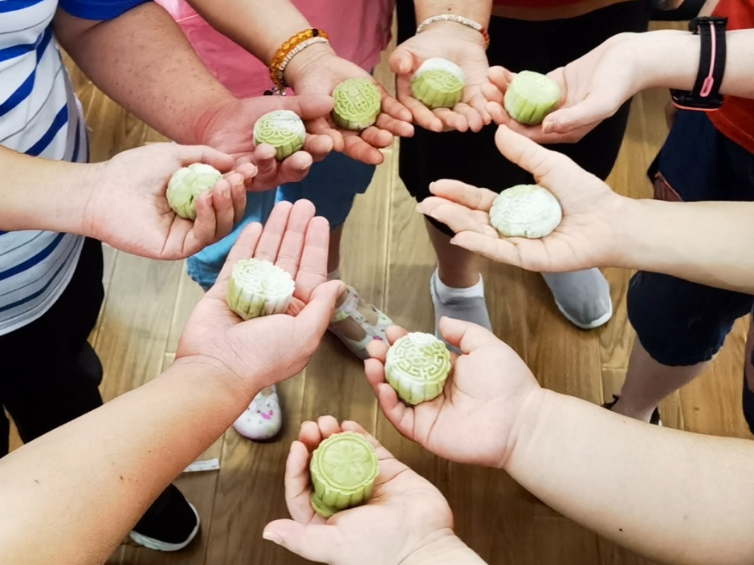 翠绿色的冰皮月饼,惹人怜爱,引得学员们也迫不及待动手制作起来。取一块冰皮、用手掌压扁、放上一块馅料、慢慢收口后,开始搓圆……只见,在社工老师指导下,学员们纷纷完成月饼制作。一些心急的学员还忍不住品尝起来,“滑滑嫩嫩,还甜甜的,真好吃!”