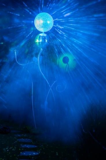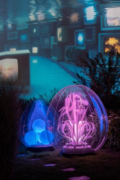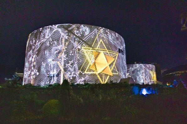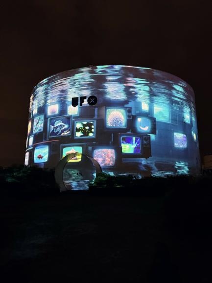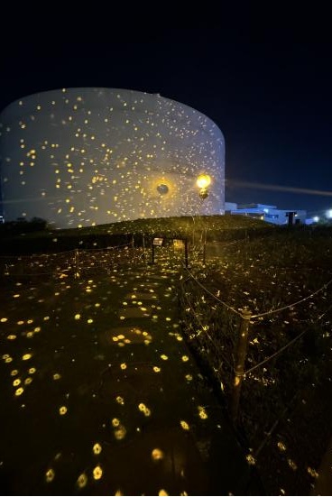循着光影继续往油罐后方走去,会发现藏在那里的惊喜彩蛋。踏入这片被巧妙改造的空间,草丛中星光起伏,Disco灯球旋转变幻,搭配空灵的环境音效,瞬间将你拉入一个未来感与原始感交织的“赛博自然”世界。从视觉到听觉,这里为你准备了沉浸式体验,让前方光影展演带来的感动与遐想,在此刻悠然延续。