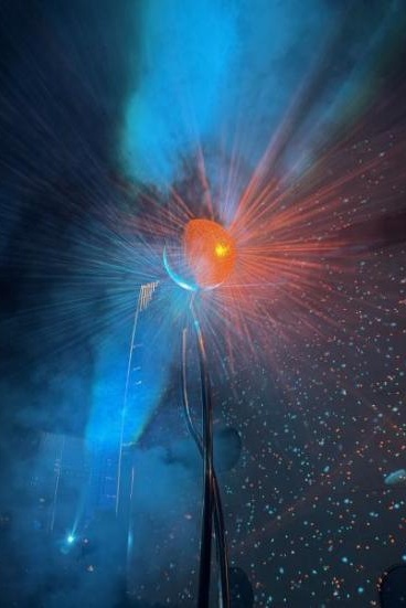 闪烁的呼吸装置如发光的果实散落在油罐周围,它们随着光影韵律轻轻起伏、明灭,以温柔光语参与着这场人与自然的对话。