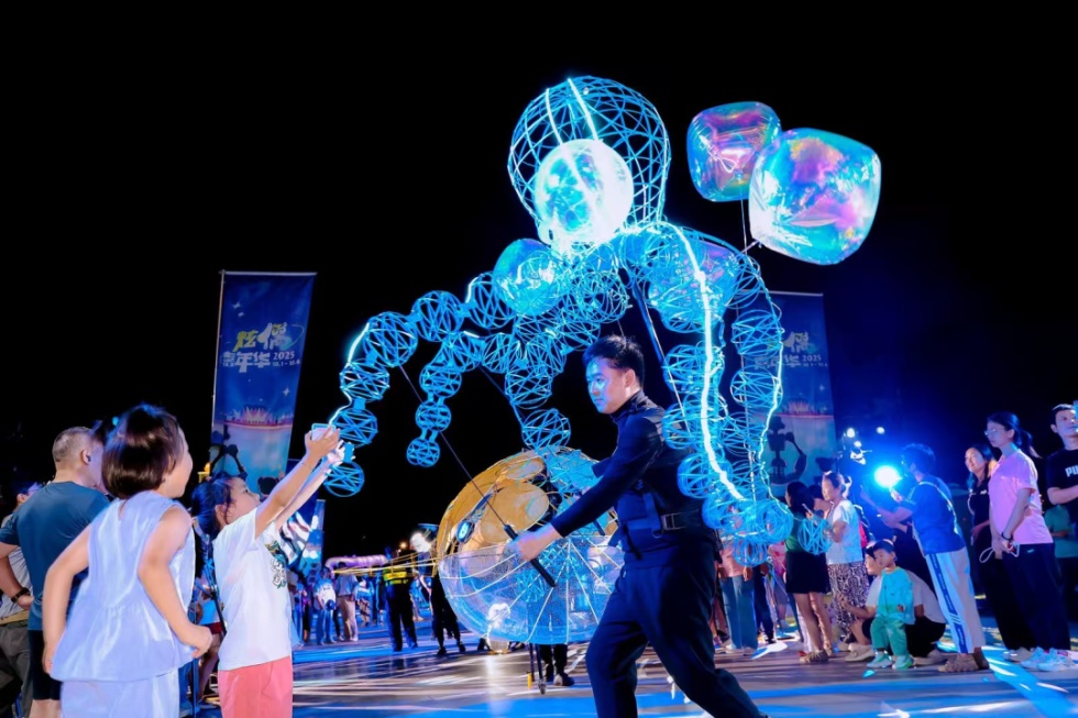 入夜时分,作为本次嘉年华的“王牌亮点”——大型木偶巡游“海洋奇缘”开启全球首演。鲸鱼、章鱼、水母等灵动发光的“海洋生物”穿梭于人群,瞬间将观众带领进入神秘的“海底艺术幻境”。