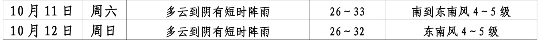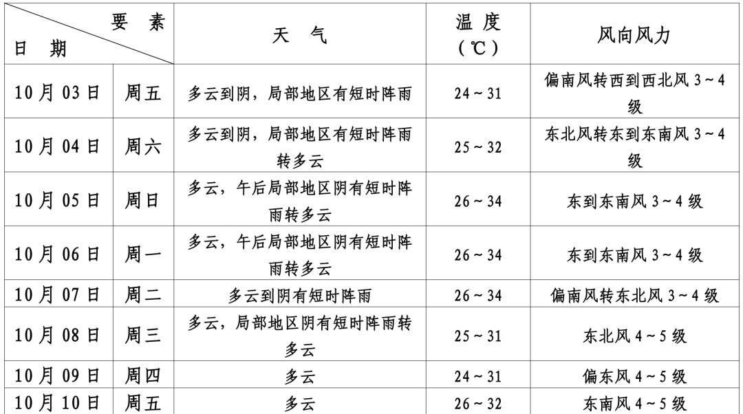 据最新气象资料分析:国庆假期期间本区处于副热带高压边缘,以多云天气为主,局部地区有短时阵雨;气温先升后降,10月5—7日最高气温34℃左右,8—9日受弱冷空气影响,最高气温略有下降。