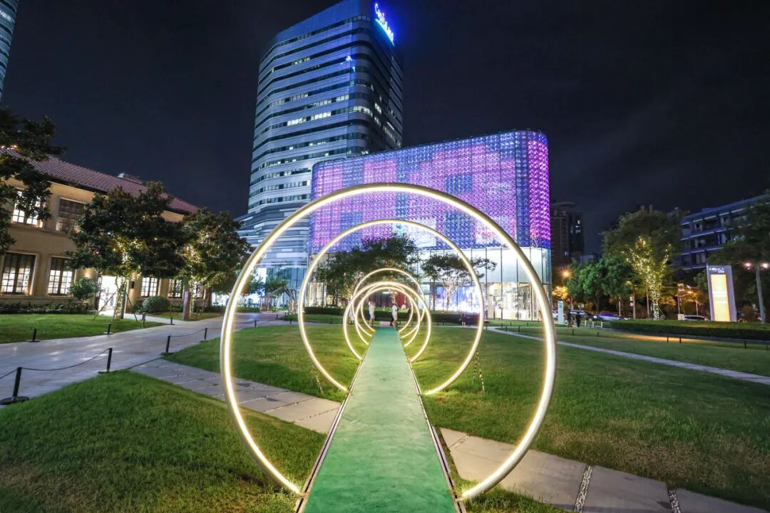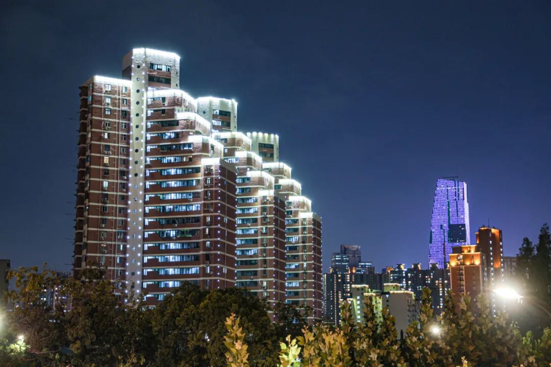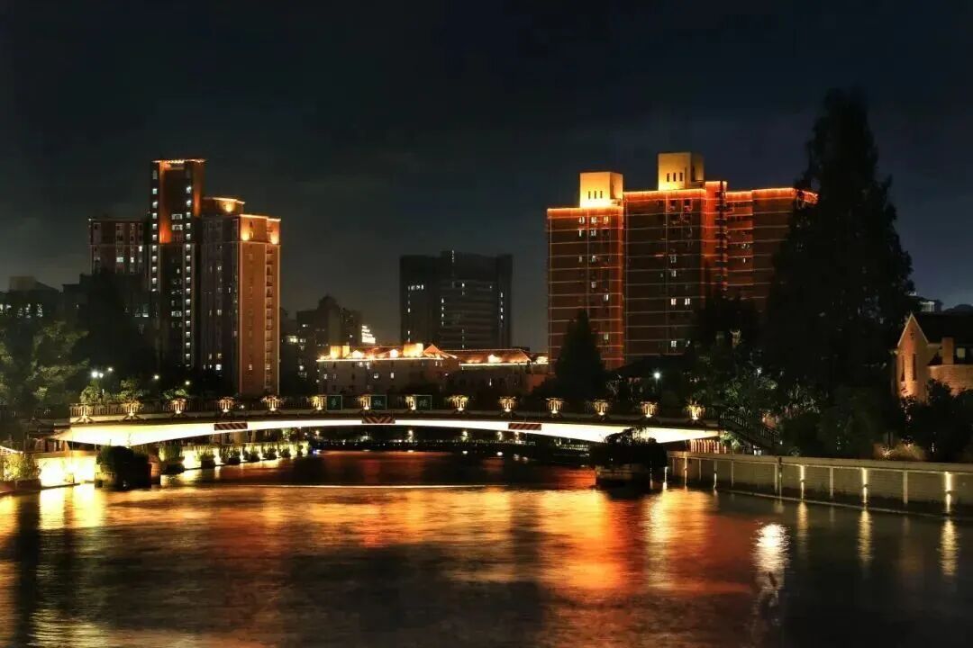 商圈周边的自然与文化景观,更让夜景的内涵愈发丰富。苏州河华政段的水面化作天然的“光影画布”,岸边灯光倒映水中,随波荡漾形成流动的“光影长河”,与河畔步道上散步、赏景的市民相映成趣,勾勒出灵动的水岸夜韵。华东政法大学中山公园万航渡路开放共享段内,百年校园建筑与光影装置碰撞,灯光勾勒出建筑的精致轮廓,书卷气与艺术感在此融合,吸引不少市民漫步其间,感受文化与光影交织的独特魅力。