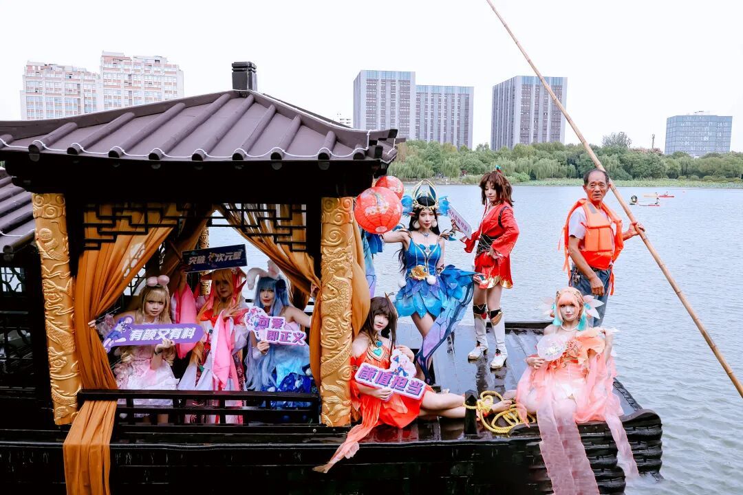 在银翔湖畔,另一场视觉盛宴正在上演。水上二次元巡游将活动推向高潮,coser们大展风采,演绎了《王者荣耀》中貂蝉、大乔等人气角色。湖边还设有主题摊位,吧唧、扇子、镭射票等精美周边可供爱好者挑选。
