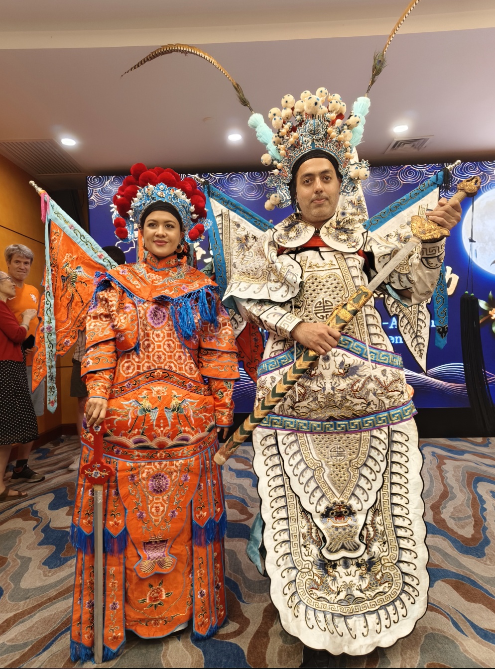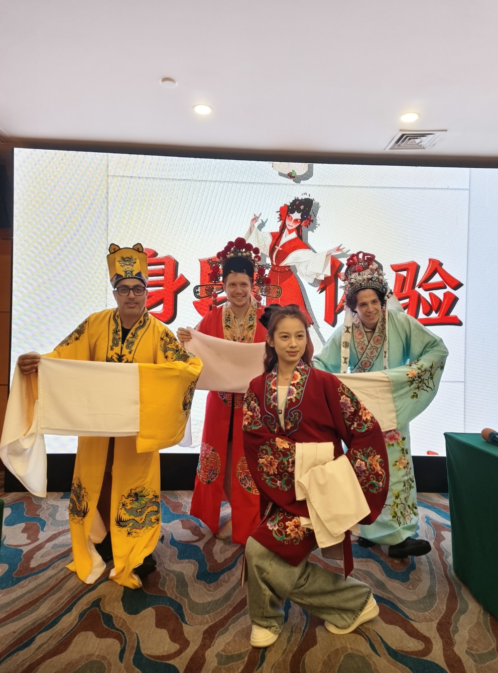 京剧不仅是中华民族的重要文化载体,更是让外籍人才触摸中国脉搏、建立情感连接的桥梁纽带。活动中,大家在京剧老师的带领下,沉浸式体验京剧的基本唱腔与标志性手势。他们时而眉头紧蹙、专注感受发声技巧,时而抬手转身、模仿水袖翻飞的姿态,在阵阵欢声笑语里,亲身领略京剧亦庄亦谐、刚柔并济的独特魅力。现场更精心设置了京剧服饰体验环节,让华美的戏服成为中外文化交融的生动注脚。