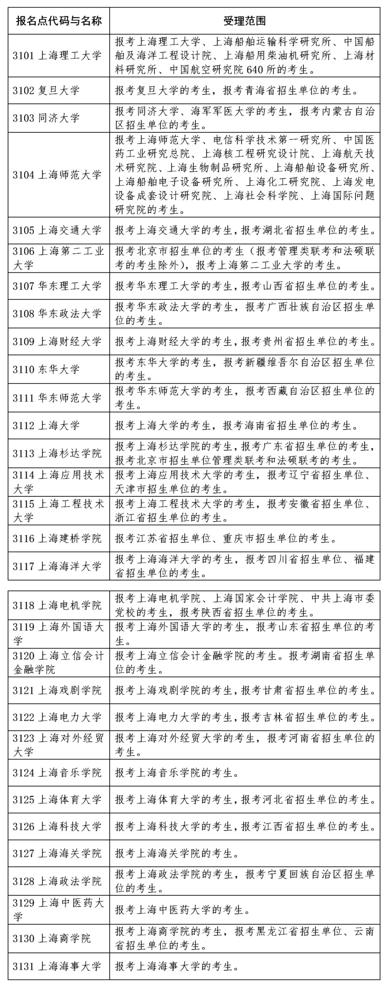 市教育考试院介绍,2026年全国硕士研究生招生考试网上预报名及缴费将于2025年10月10日上午9点开始,而网上报名及缴费时间也将从2025年10月16日上午9点开始。为助力考生顺利报名,现将网上报名时间、流程、相关要求、报名确认有关流程、其他提示、网上确认报名点安排表等告知大家,具体信息详见↓ 一、网上报名 1.网上报名时间 网上预报名及缴费时间为2025年10月10日至10月13日(每天9:00-22:00)。 网上报名及缴费时间为2025年10月16日至10月27日(每天9:00-22:00)。 2.网上报名流程 考生应在规定时间登录“中国研究生招生信息网”(网址:https://yz.chsi.com.cn,以下简称“研招网”)浏览报考须知,并按教育部、上海市教育考试院、上海市报考点以及报考招生单位的网上公告要求报名。报名期间,考生可自行修改网上报名信息或重新填报报名信息,但每位考生只能保留一条有效报名信息。逾期不得修改报名信息。 3.网上报名要求 (1)考生报名时只能填报一个招生单位的一个专业。 (2)考生应当认真了解并严格按照报考条件及相关政策要求填报志愿并选择报考点。因不符合报考条件及相关政策要求,造成后续不能网上确认、考试(含初试和复试)或录取的,后果由考生本人承担。 (3)考生应当按要求准确如实填写个人网上报名信息并提供真实材料。考生因网上报名信息填写错误或填报虚假信息等情况造成不能考试(含初试和复试)或录取的,后果由考生本人承担。 (4)具有推荐免试资格的考生,须在教育部规定的时间内登录“全国推荐免试攻读研究生(免初试、转段)信息公开暨管理服务系统”报名。已被招生单位录取的推免生,不得再报名参加当年全国统一考试、单独考试。截至规定日期未被招生单位录取的推免生,其推免资格自动失效。 对服役期间获得三等战功、二等功以上奖励或者二级以上表彰,符合全国硕士研究生招生考试报考条件的退役人员,可申请免初试攻读硕士研究生。符合免初试资格的考生,应在教育部规定的全国统考报名时间内登录“全国推荐免试攻读研究生(免初试、转段)信息公开暨管理服务系统”(网址:https://yz.chsi.com.cn/tm)报名,逾期不得补报。招生单位对审核通过的考生组织复试,复试合格者即可予以拟录取。 报考“退役大学生士兵”专项硕士研究生招生计划的考生,应为高校学生应征入伍退出现役,且符合全国硕士研究生招生考试报考条件者〔高校学生指全日制普通本专科(含高职)、研究生、第二学士学位的应(往)届毕业生、在校生和入学新生,以及成人高校招收的普通本专科(高职)应(往)届毕业生、在校生和入学新生〕。考生报名时应当选择填报退役大学生士兵专项计划,并按要求填报本人入伍前的入学信息以及入伍、退役等相关信息,复试前须向招生单位提供《入伍批准书》和《退出现役证》进行复核。 (5)考生网上报名成功后,应通过定期查阅上海市教育考试院、报考点、招生单位官方网站等方式,主动了解网上确认、考试安排等事项,积极配合完成相关工作。 二、网上确认 1.网上确认时间 2025年10月31日至11月5日12:00(首次材料上传开始时间至截止时间,逾期不能上传),审核不通过需要补充材料的截止时间为11月5日17:00。 2.网上提交所需证明材料 (1)考生网上确认时应积极配合签署《考生诚信考试承诺书》并遵守相关约定,认真核对并确认本人报名信息,根据核验工作要求提交补充材料,逾期不得补办。考生应当按报考点规定配合采集本人图像等相关电子信息。 (2)非上海市高校应届本科毕业生:本市户籍考生还需上传本人上海市户口簿图像,非本市户籍考生还需上传本人2025年连续六个月的上海社保缴费成功记录图像。(具体要求参见报考点公告) 3.网上确认要求 (1)所有考生应当在规定时间内核对并确认其网上报名信息,逾期不再补办。因考生不按照规定上传材料导致网上确认不通过的,责任由考生本人承担。 (2)报名信息经考生确认后一律不作修改,因考生填写错误引起的一切后果由其自行承担。 三、其他提示 1.在本市参加2026年全国硕士研究生统一考试的考生应当按规定缴纳报考费,报考费根据上海市物价局沪价费〔2003〕69号文件规定的128元/人执行。 2.以同等学力报考人员的报名条件请在报名前咨询有关招生单位。 3.考生应当在考前十天左右,凭网报用户名和密码登录“研招网”自行下载打印《准考证》。《准考证》使用A4幅面白纸打印,正、反两面在使用期间不得涂改或书写。考生凭下载打印的《准考证》及本人有效居民身份证参加初试和复试。 4.考生考试地点以准考证上的考点地址为准。 5.有关报考招生单位具体事宜请向招生单位咨询或查阅该单位相关网站,报考政策及动态可登录“上海招考热线”网站查询。 四、上海市2026年全国硕士研究生招生考试考生网上确认报名点安排表 网上确认时间:2025年10月31日至11月5日12:00(首次材料上传开始至截止时间,逾期不能上传),审核不通过需要补充材料的截止时间为11月5日17:00。 点击可查看大图 点击“阅读原文”查看详情↓