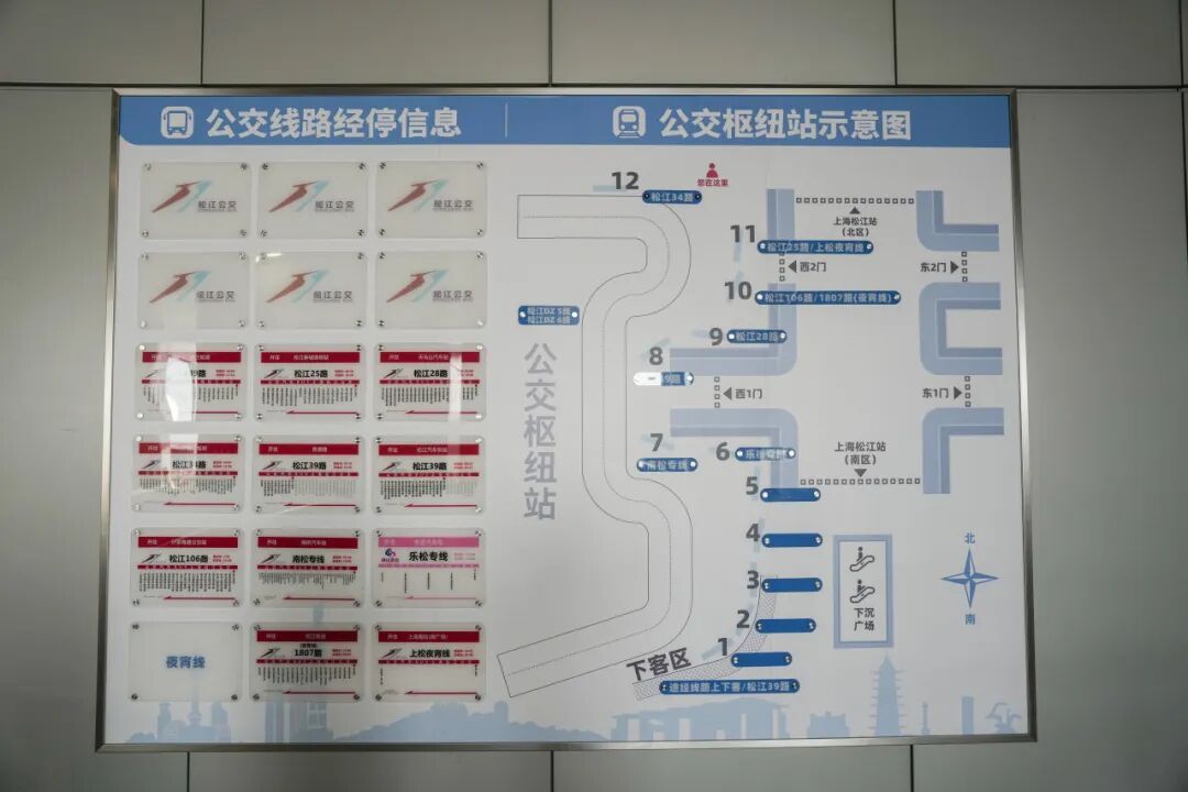 常规公交:目前从上海松江站始发常规公交线路共计10条(即区内7条:松江25路、松江28路、松江34路、松江39路、松江106路、1807路、1849路,跨区3条:上松夜宵线、乐松专线、南松专线),线路服务范围辐射松江新老城区、西北片区、南部大居片区以及金山、奉贤、上海南站等主要区域。其中,上松夜宵线(松江枢纽-上海南站)运营时间为22:45-次日1:00。