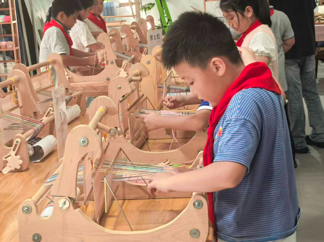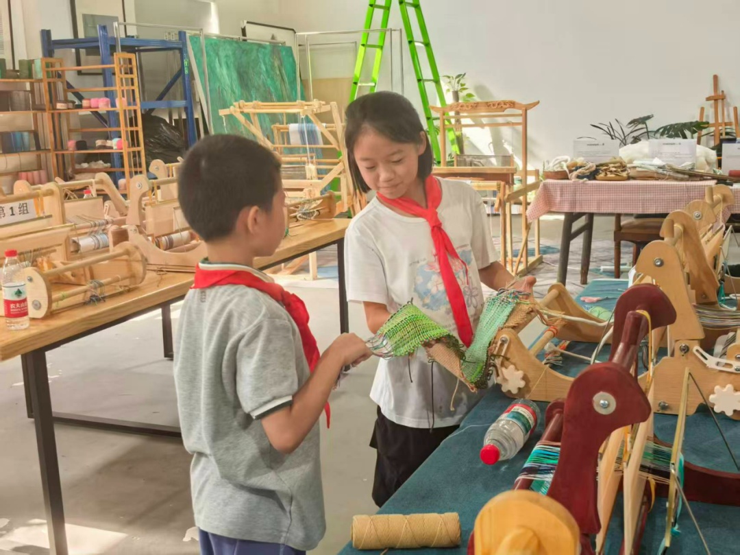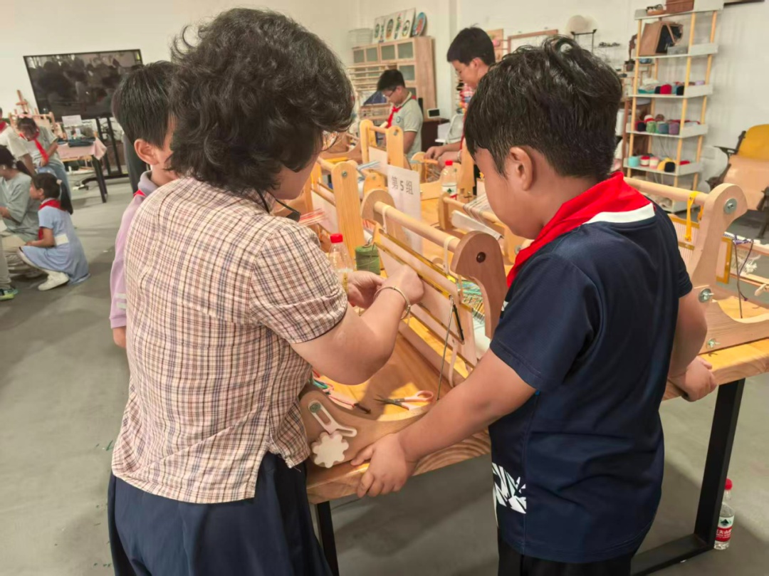 本次课程共分为四部分,从棉花的生长,到纱线的纺织,再到织布机上的操作,最后完成自己的作品。为了让小朋友们轻松入门,基地特别设计了贴合小学生认知水平的课程内容,每期主题独立且趣味十足,同时适当降低了动手环节的操作难度,确保每名孩子都能“玩得转、学得进”。“孩子们都很有兴趣,学习的积极性都很高。”基地老师王颖欣慰地说。经过学习,四年级学生丁荞荞凭借优秀的配色和作品完成度拿到了老师的锦鲤制品奖励,在她看来,基地的老师们都是非常值得尊敬的人,“老师们都非常认真地想要教会我们,我的学习动力很足”。