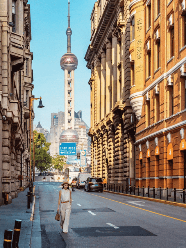 2️⃣ 北京东路沿街:在益丰・外滩源北门所在的北京东路,使用长焦镜头,以第三根电灯柱为机位,可将老建筑与远处的新大厦同框,把人物和背景压近,展现顶尖繁华与历史沉淀并存的上海形象